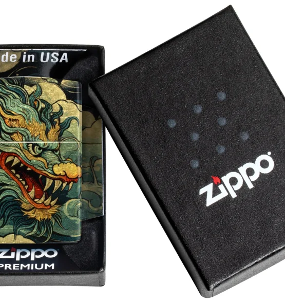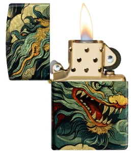 A brilliant, flowing dragon soars around every surface of this classic Tumbled Brass lighter in a stunning 540 Fusion design, which incorporates the shimmering brass tones of the lighter case for added intrigue. Comes packaged in a gift box. For optimal performance fill with Zippo lighter fuel.